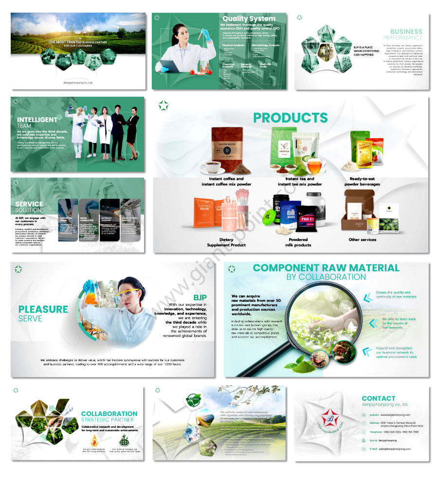 ยกระดับการนำเสนอผลิตภัณฑ์และบริการของคุณด้วย slide presentation ที่ออกแบบมาอย่างมืออาชีพ ติดต่อ Giant Point วันนี้เพื่อค้นหาวิธีที่เราสามารถช่วยคุณสร้างความประทับใจที่ยาวนาน